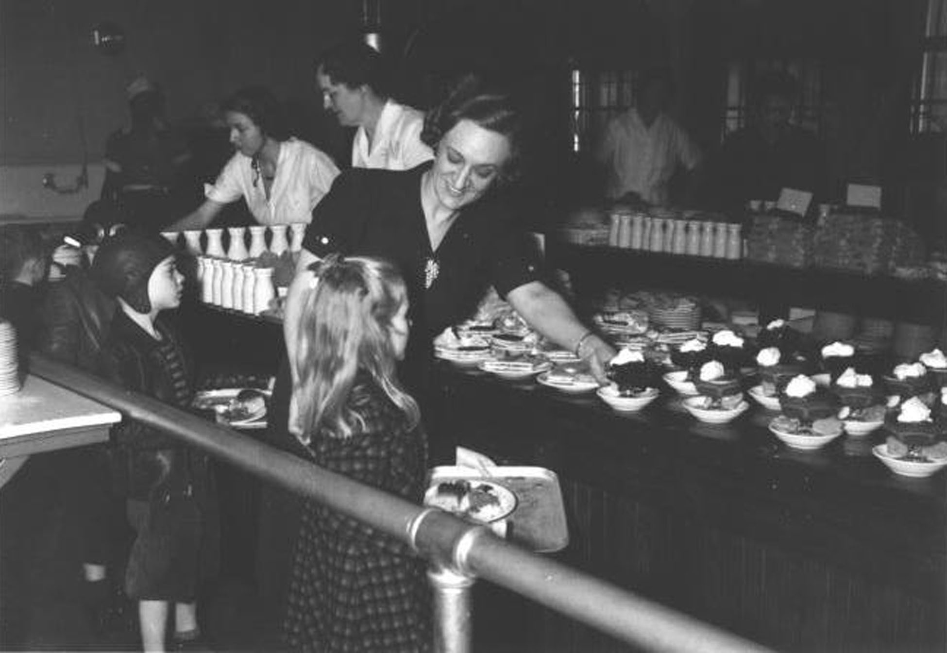Lunch-Worker-handing-child-a-dessert-1942