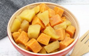 La batata dulce o camote es un vegetal de raíz nativo de América del Sur, Centroamérica, México y las Antillas. Esta combinación de batatas dulces y manzanas crea un plato dulce y delicioso que los niños y los adultos disfrutaránOrigen: Proyecto de recetas multiculturales para el CACFP - Team Nutrition. https://teamnutrition.usda.gov